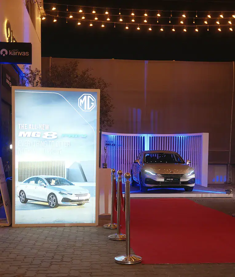 MG sought more than a product presentation. They wanted an exclusive evening that would merge automotive innovation with atmosphere – positioning the MG8 PHEV as a refined, future-forward hybrid for discerning guests, media, and partners. The challenge: create a seamless narrative from red-carpet arrival to immersive reveal and experiential dining.